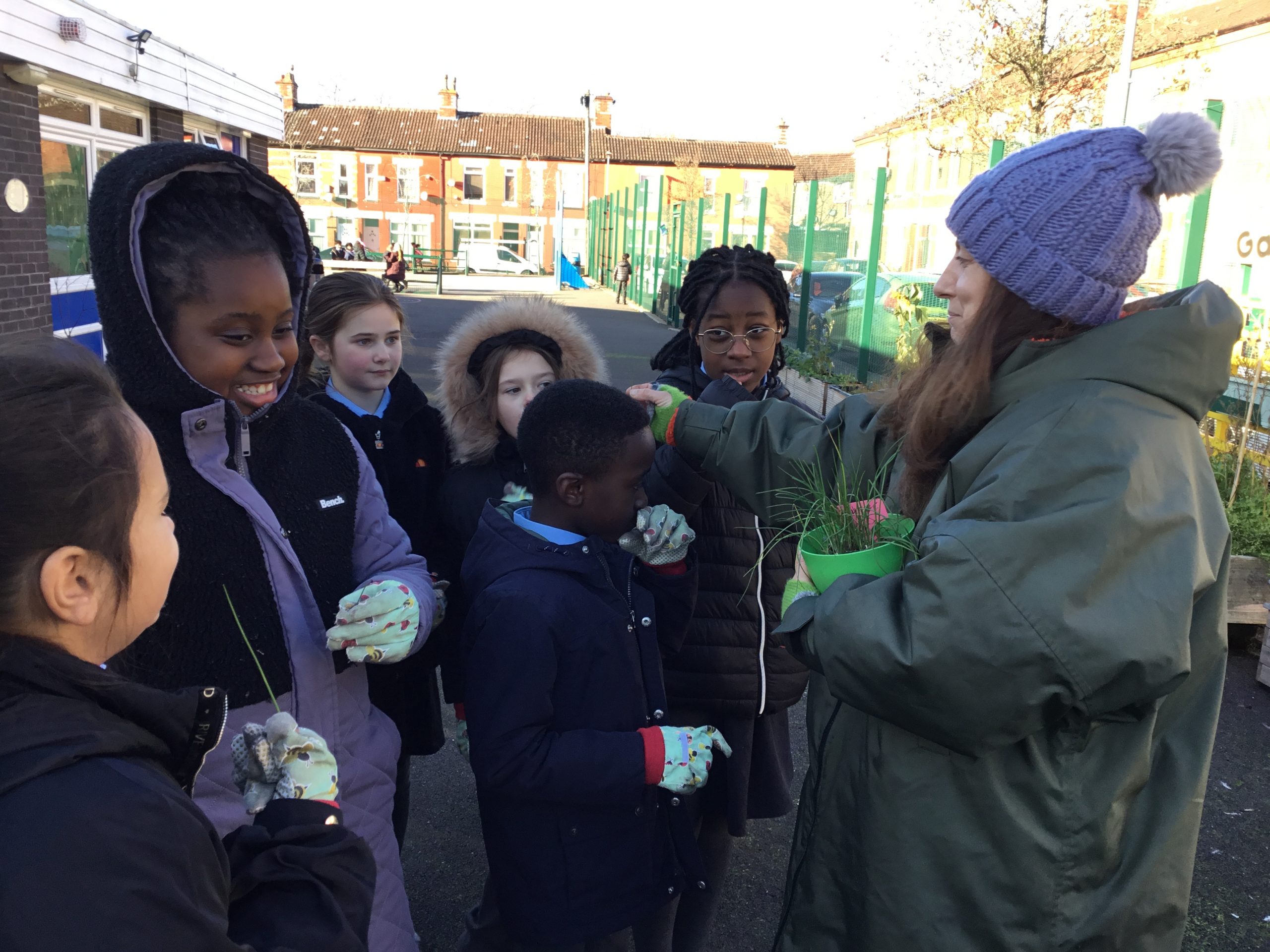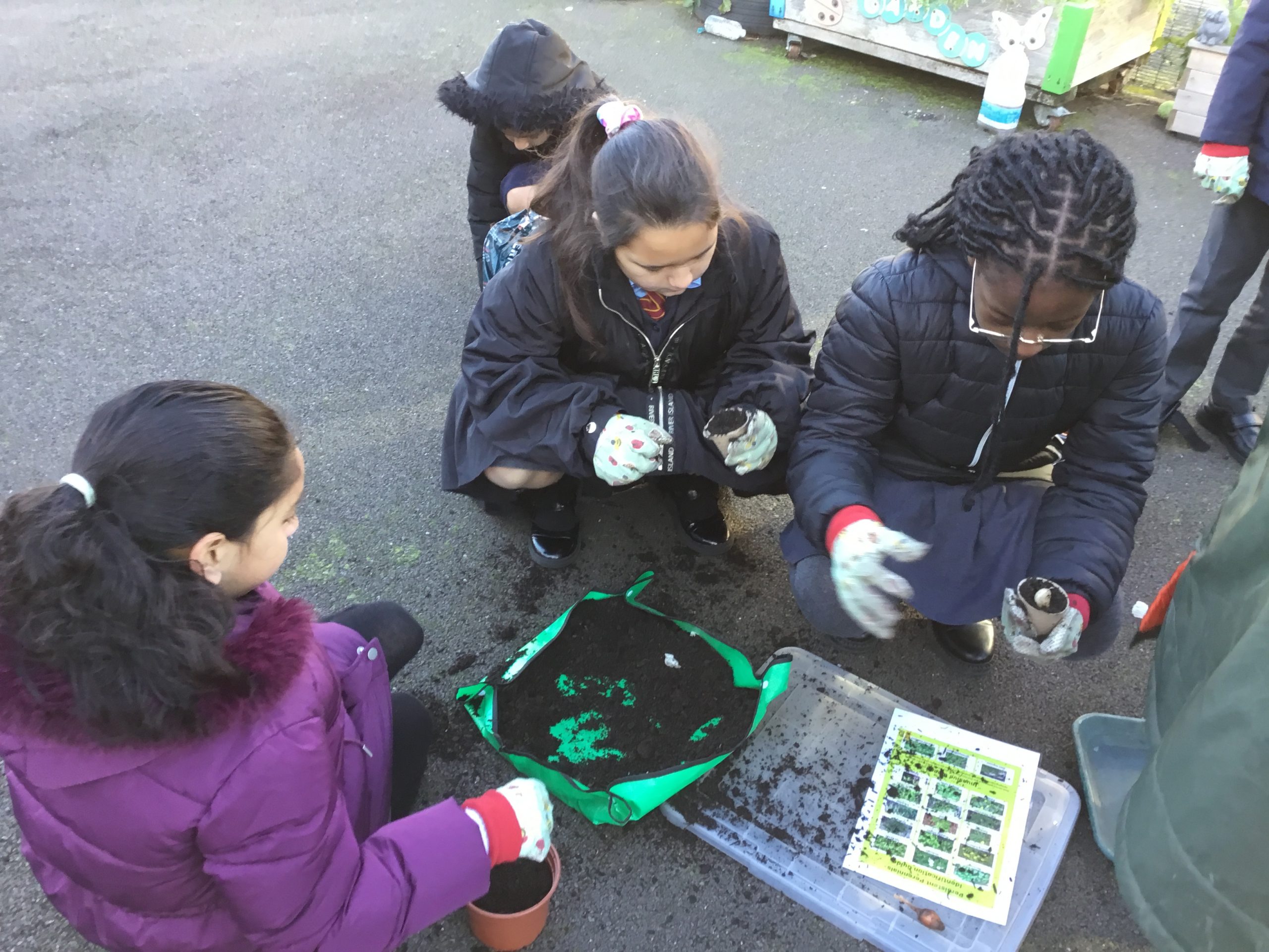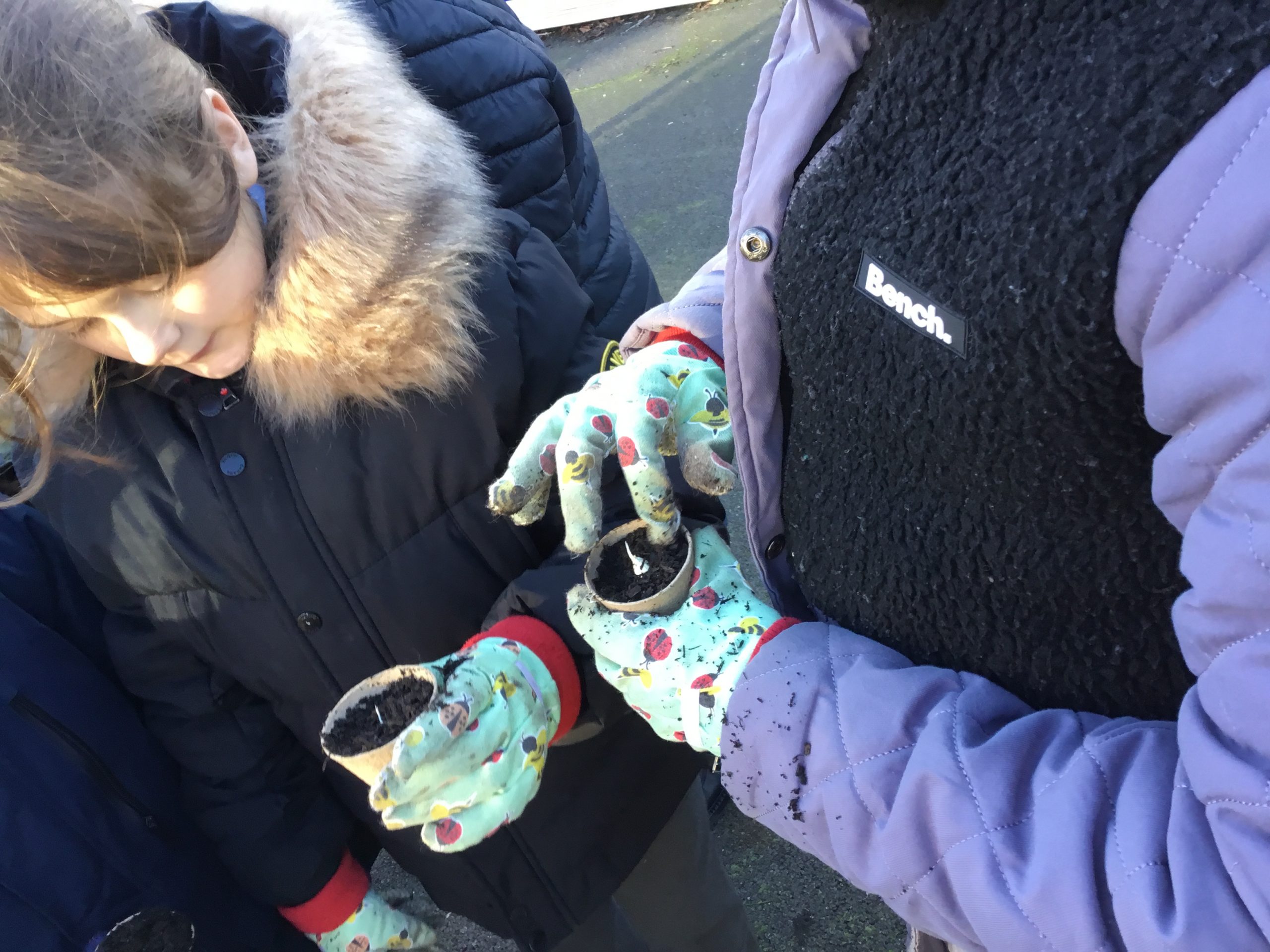 The Eco-Council (with some additional helpers!) were visited today by Jannine from ‘School Food Matters’. We are very lucky to be one of three schools chosen to take part in their ‘Garden Gurus’ programme. Jannine taught the Eco-Councillors all about seed germination and different types of seeds to plant at different times of the year. We worked together to plant a variety of herbs and vegetables in our new greenhouse and planters! We look forward to seeing how our seeds grow.